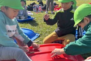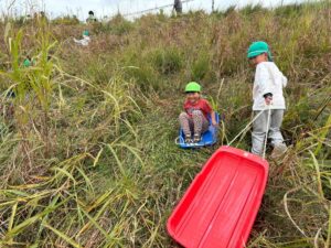 草すべりのほかに、バッタがいることにも気づき、豊な環境に積極的にかかわる子どもたちでした。