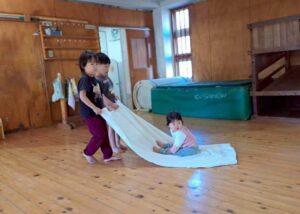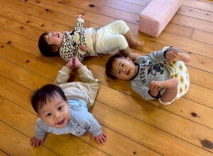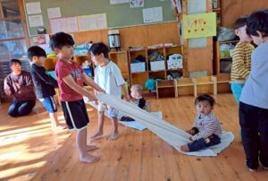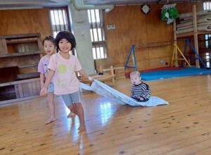 「そり」で引っ張ってもらう0歳児の子どもたちです。