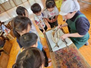 お台所の先生たちが『大きな青魚』を焼いてくれ、みんなで美味しくいただきました。